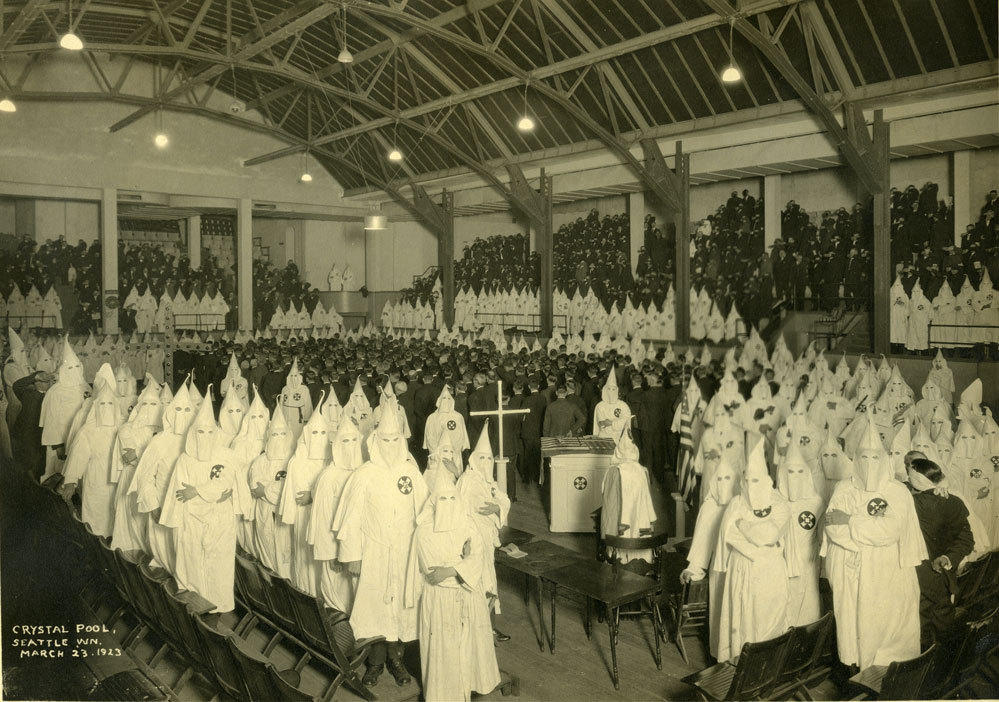 A Ku Klux Klan meeting in Seattle in 1923. After Reconstruction, a white backlash ensued, inaugurating a new era of restoration in American history, out of which grew Black Codes, the Ku Klux Klan and Jim Crow laws. (Washington State Historical Society)
